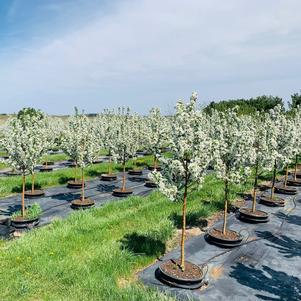 Gracefully weeping white blooms on pendulous branches; persistent glossy fruit attracts birds.